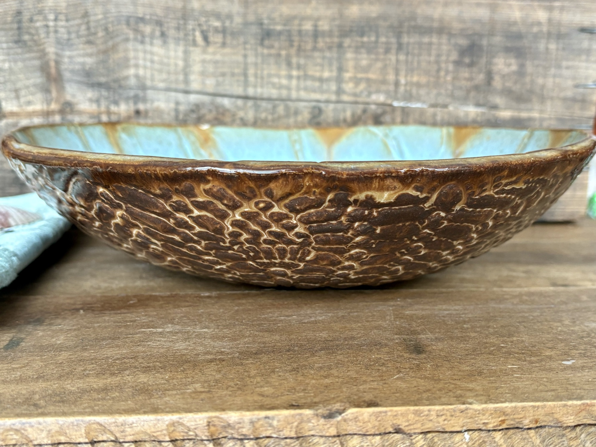 I like to create using a mix of hand building and wheel throwing methods. Wheel throwing gives me a sense of zen… symmetry, form and consistency…while hand built pieces lend to organic, free flowing shapes that fit the nooks and crannies of my hand beautifully. I enjoy both free~form hand building and using unique molds. I enjoy using molds that are made from naturally occurring forms such as tree burls & coconut shells. This creates an organic feel, for each piece is truly unique from the others and are not exact in form. It is their imperfections in shape and form that add to their beauty.