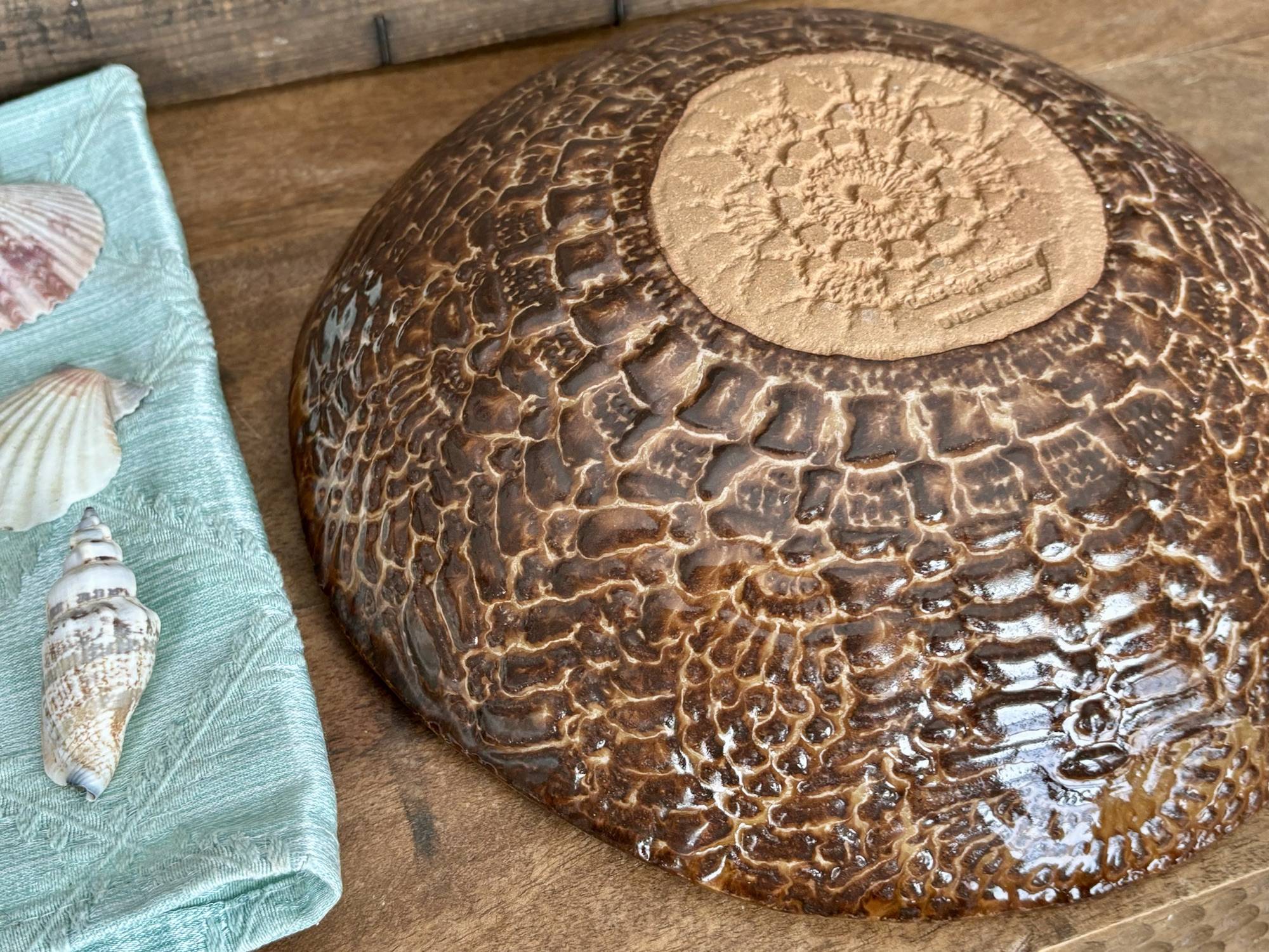 I like to create using a mix of hand building and wheel throwing methods. Wheel throwing gives me a sense of zen… symmetry, form and consistency…while hand built pieces lend to organic, free flowing shapes that fit the nooks and crannies of my hand beautifully. I enjoy both free~form hand building and using unique molds. I enjoy using molds that are made from naturally occurring forms such as tree burls & coconut shells. This creates an organic feel, for each piece is truly unique from the others and are not exact in form. It is their imperfections in shape and form that add to their beauty.